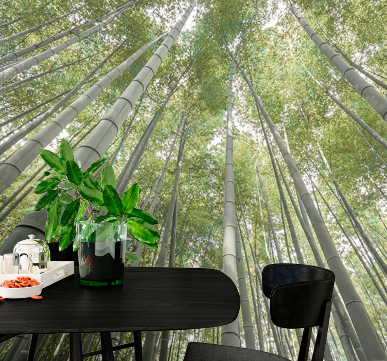 Reference: F12097Design zobrazuje vysoký bambusový les viděný zespodu, kde se štíhlé bambusové stonky tyčí vzhůru. Husté zelené listy jemně filtrují světlo a vytvářejí klidnou atmosféru, ideální pro ty, kteří hledají spojení s přírodou.