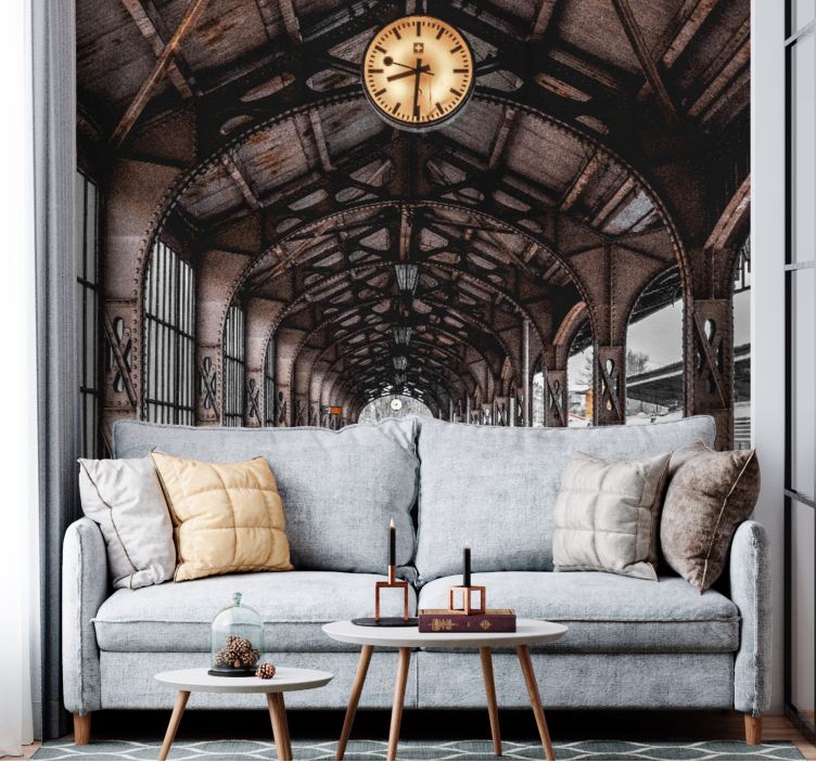 Reference: F10701Složitý pohled na oblouk stanice s výraznými hodinami nad hlavou. Design zachycuje strukturální eleganci s odhalenými trámy a řadami oken, což vyjadřuje pocit pohybu a času. Monochromatické tóny posilují vintage atmosféru a vyvolávají reflexivní náladu.