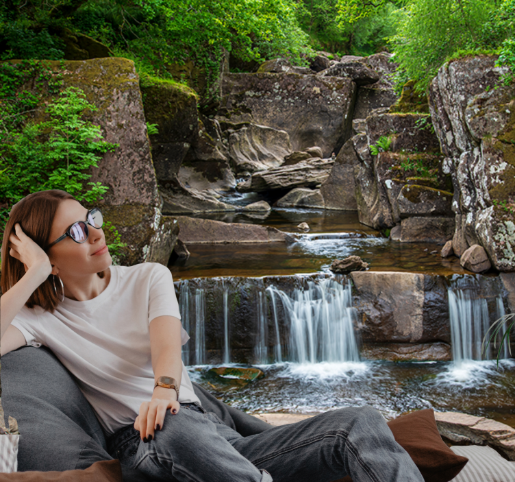 Reference: F12155Scéna zobrazuje fascinující vodopád, který se valí přes drsné skály, obklopený živou zelení. Tato klidná krajina vybízí k odpočinku a ukazuje krásu přírody v její nejčistší podobě, což z ní činí ideální prostředí pro obnovu a klid.