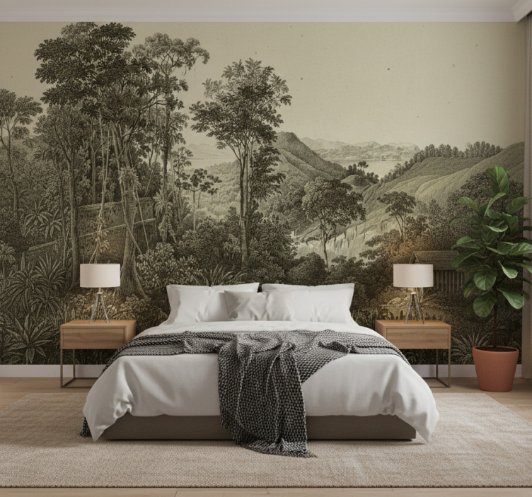 Reference: F11912Podrobná nástěnná malba zobrazuje rozsáhlou krajinu plnou husté vegetace a vysokých stromů. Vlnité kopce se táhnou do dálky a vytvářejí poklidnou atmosféru. Scéna zachycuje harmonickou směs přírody, která zahrnuje klidnou vodní plochu a náznaky vzdálených hor, vyzývající k prozkoumání tohoto idylického prostředí.