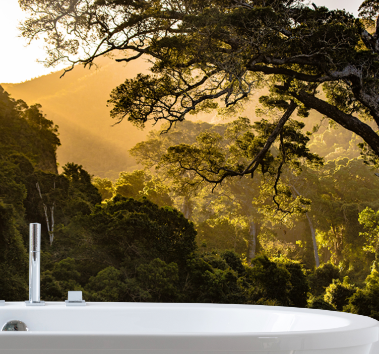 Objevte kouzlo přírody s naší Příroda fototapeta zelené lesní scenérie. Tento jedinečný design zachycuje nádherné stromy, klidné lesy a zářivé sluneční světlo, které proniká skrze koruny stromů. S malebnými horami v pozadí a přirozeným osvětlením, které vytváří útulnou atmosféru, je tato fototapeta ideální volbou pro každou místnost, ve které toužíte po kousku přírody!