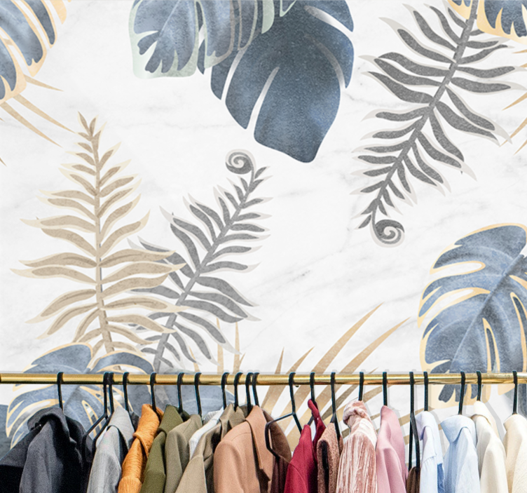 Reference: F12220Elegantní design s různými listy a zelení v kombinaci barev. Složitá aranžmá zachycuje podstatu přírody a ukazuje kombinaci tropických a kapradinových listů, čímž vytváří osvěžující a klidnou atmosféru.