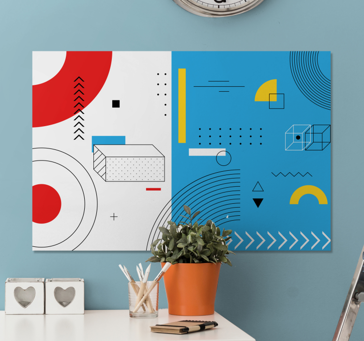 Geometrická obraza kompozice geometrických tvarů je fascinující designový prvek, který v sobě nese abstraktní krásu různých geometrických tvarů. S kombinací kruhů, trojúhelníků, obdélníků, šipek a teček vytváří jedinečný vzor, který okamžitě zaujme každého návštěvníka vaší místnosti. Tento produkt přináší harmonii a moderní dotek do vašeho interiéru, což ho činí ideálním doplňkem pro každou domácnost.