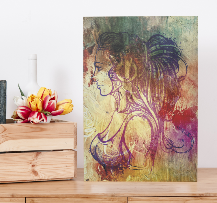 Reference: Q6417Působivý profilní silueta ženy s volně plynoucími vlasy, důmyslně ilustrovaná na texturovaném pozadí. Design zachycuje podstatu ženskosti a zároveň předvádí detailní liniovou práci a živé skvrny barev, čímž vytváří harmonickou směs umění a vyjádření.