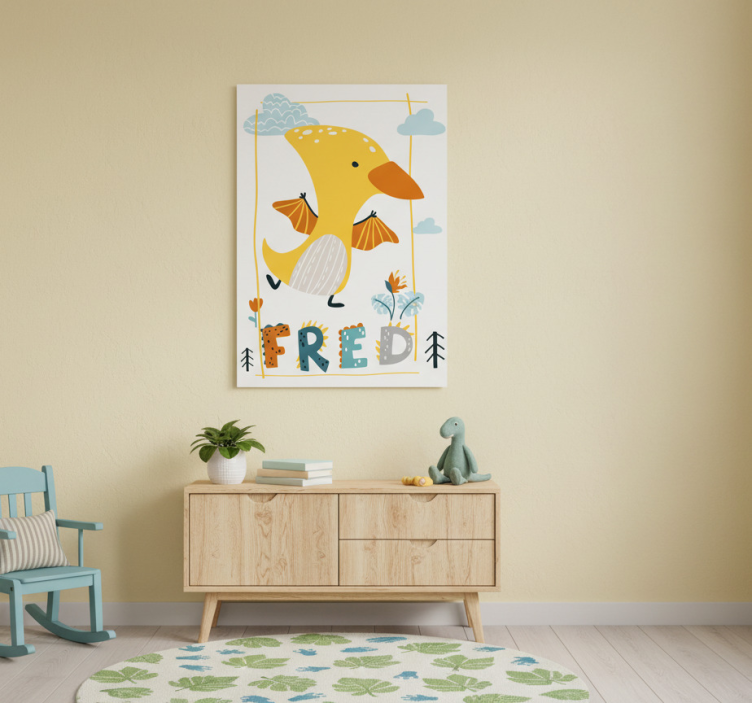 Vibrantní ilustrace zobrazuje radostného žlutého ptáka jménem Fred. Tento hravý charakter má jasně oranžová křídla a hravý úsměv, obklopený barevnými květinami a stromy. Na bílém pozadí, veselá umělecká díla zahrnují tučné písmo, což z něj činí ideální dekoraci pro děti a dodává jakémukoli prostředí nádech zábavy.