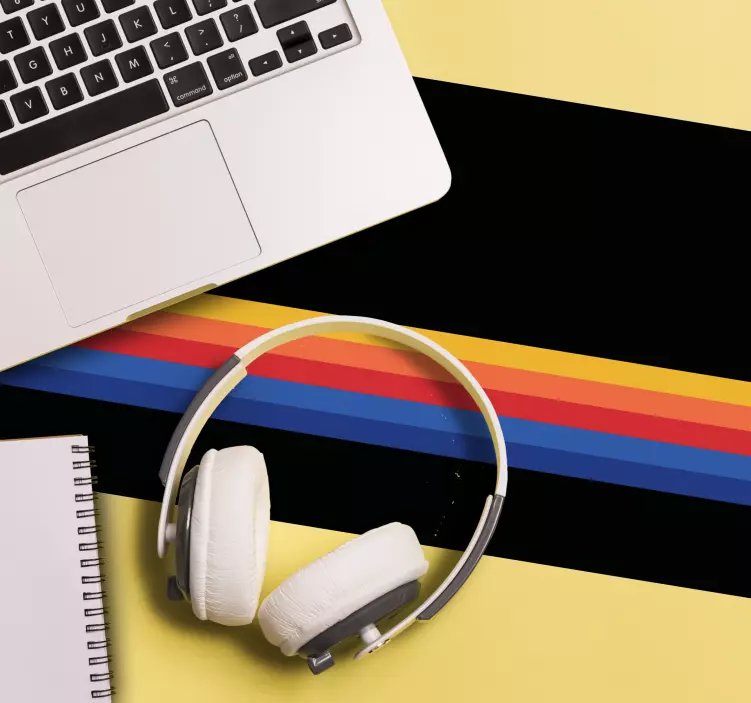 Tento design má černé pozadí se žlutými, oranžovými, červenými a tmavě modrými pruhy v horizontální orientaci. Tato duhová vintage pruhy abstraktní linie podložka pod myš je vyrobena z kvalitního vinylu, který je bezpečný pro vaši pokožku a příjemný na zápěstí.