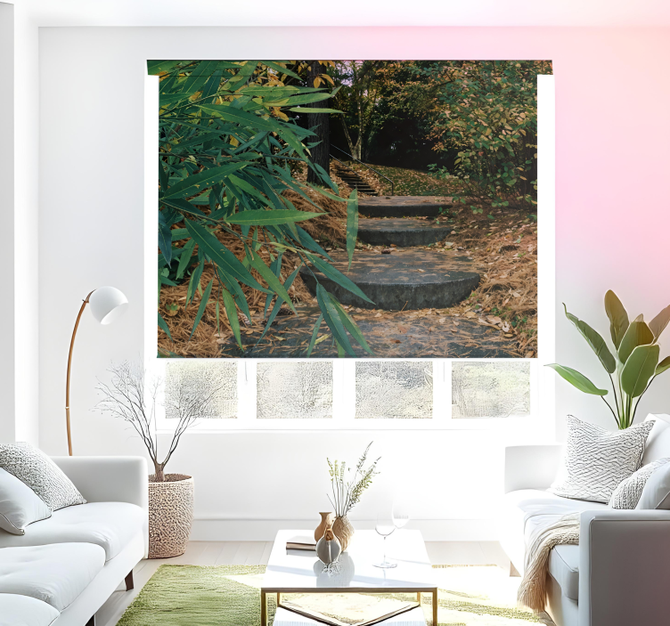 Tato lesní krajina s kamennými schody a květinovou roletou do obývacího pokoje, která může být vaše v různých velikostech.