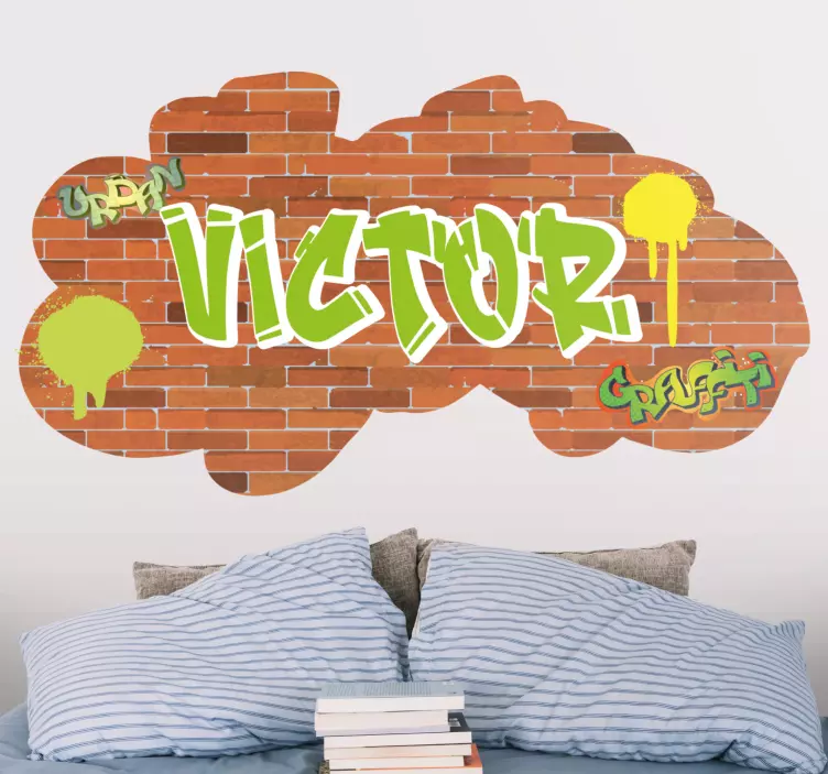 Reference: A49593Živý a přizpůsobitelný kousek s názvem v odvášném graffiti stylu na cihlovém pozadí, zdobený barevnými skvrnami. Ideální pro přidání osobního doteku do jakéhokoli prostoru, tento design posiluje městskou estetiku a umožňuje individuální vyjádření.