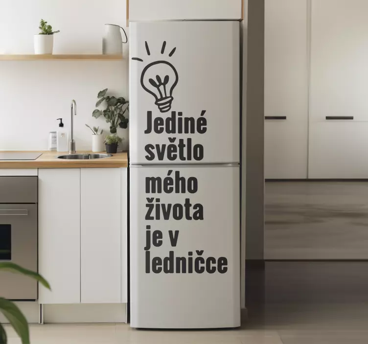 Reference: A39266Jediné světlo v mém životě Nálepka lednice je designový produkt, který kombinuje ledničku, text, vtipný citát, žárovku a češtinu. Jeho grafický design je jedinečný a atraktivní. Tato nálepka dodá ledničce originalitu a osobitost. S vynikající intenzitou barev a saténovým povrchem, který nevytváří odlesky, bude tento produkt přitahovat pozornost a vyvolávat úsměv na tváři. Můžete si být jisti, že tato nálepka bude skvělým doplňkem vaší kuchyně a přinese do ní jedinečný a veselý prvek.