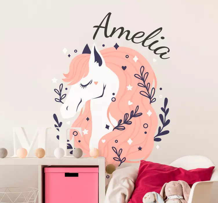Roztomilý koňský hlavy design ilustrace s přizpůsobitelným názvem. Tento výrobek je perfektní dekorace do ložnice pro děti, které milují koně. Samolepky mohou být vyzdobeny v herně, školce, na školním dvoře a kdekoliv jinde. Vysoce kvalitní vinyl, který používáme, zajišťuje, že se při aplikaci nevytváří vzduchové bubliny. Vyberte si velikost, která Vám nejlépe vyhovuje, a objednejte si tento fantastický produkt pomocí našich zabezpečených platebních možností.