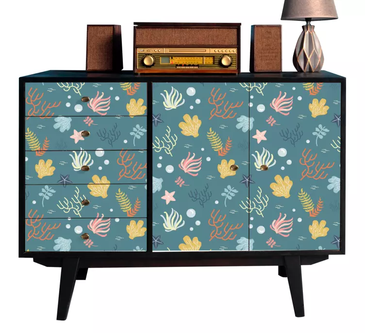 Tento cool design nábytkové samolepky obsahuje ilustrace pod mořskými korály a dalšími podvodními živými tvory na měkkém pozadí. Aplikace nálepky je snadná a lze ji kdykoli odstranit, což umožňuje jakémukoli prostoru nábytku vypadat nádherně. Tento obtisk lze přizpůsobit v libovolné velikosti a je odolný. Při použití se nemačká ani nevytváří bubliny, takže váš nábytek bude vypadat jako nový. Navíc, na našem webu najdete mnoho dalších úžasných designů nálepek pro váš nábytek.