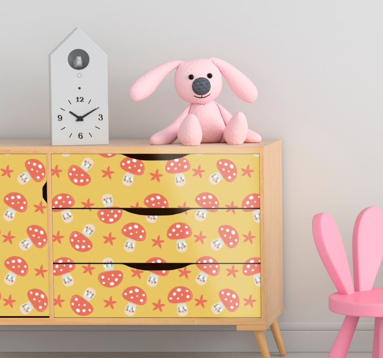 Objevte kouzlo naší Nábytek nálepka design s houbovým vzorem, která přináší do vašeho domova veselou atmosféru! Tento jedinečný design zdobí nádherné muchomůrky, hvězdy a houby na žlutém pozadí, což vytváří mood plný hravosti a radosti, ideální pro dětskou výzdobu. Vytvořte si prostor, který bude inspirovat vaše děti k hrám a fantazii!