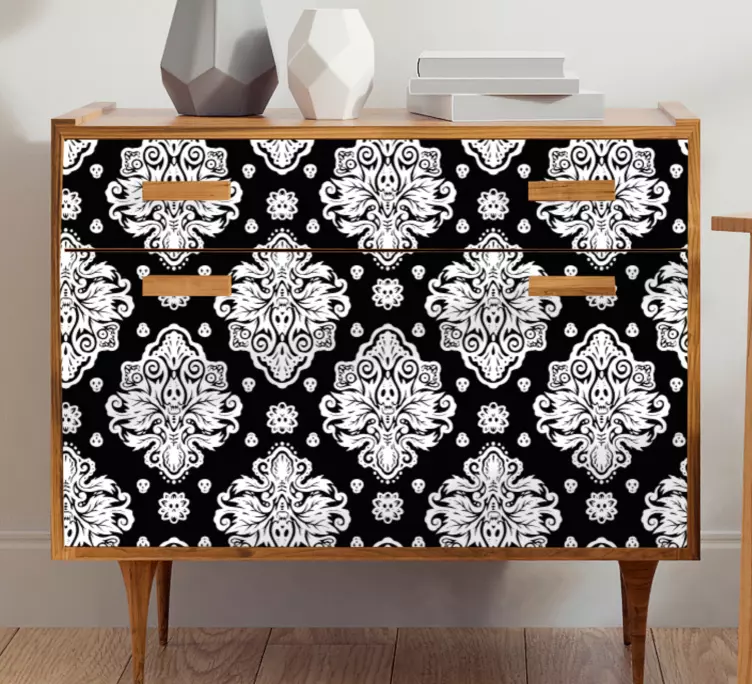 Objevte jedinečný design naší Nábytek nálepka elegantní vzorová fólie, která kombinuje moderní styl s dekorativními prvky jako jsou lebky, květiny a damašek. Tento vyšperkovaný vzor v černé a bílé barvě dodá vašemu domácímu interiéru šmrnc a eleganci. Vytvořte si originální prostor, kde se setkávají jedinečné prvky designu nábytku s neotřelým uměním!