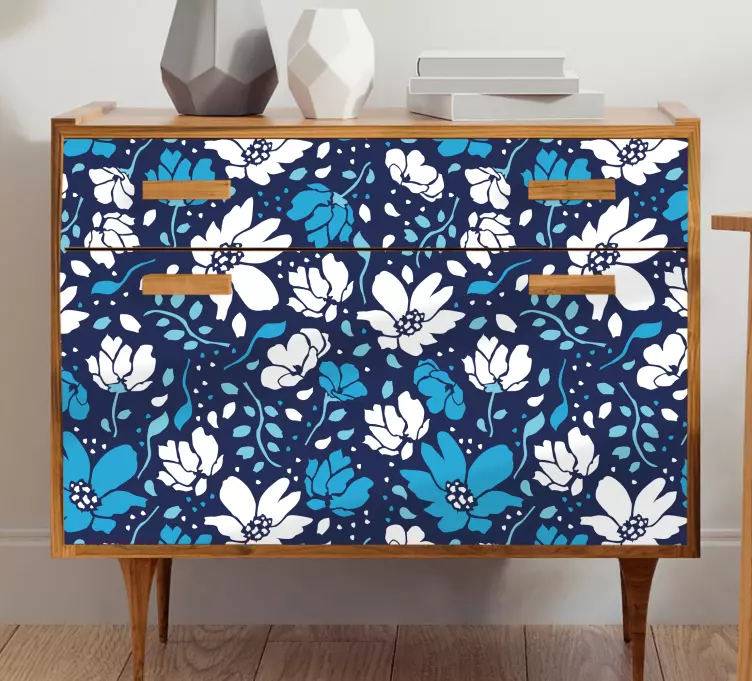 Nábytek nálepka s květinovým motivem na šuplíky přináší do vašeho domova kouzlo přírody a svěžest. Design je inspirován krásou sedmikrásek a dalších květin, které se v harmonickém modrém a bílém odstínu snoubí s jemnými listy. Tento květinový vzor je ideální volbou pro ty, kteří chtějí oživit svůj nábytek a přinést do interiéru přírodní atmosféru.