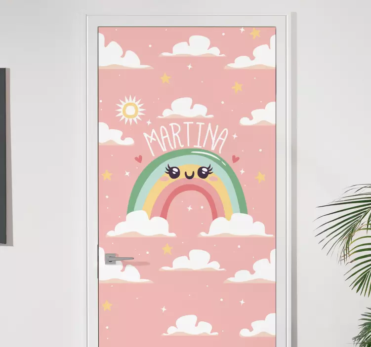 Vytvořte si jedinečný design s naší samolepkou na dveře s vlastním duhovým designem, která promění vaše dveře v kouzelné místo! Tento nádherný grafický design, inspirovaný mraky a slunečními paprsky, přináší radost a zábavu do každého prostoru. Duhové barvy a personalizovaný název dodají vašim dveřím roztomilý a hravý vzhled, který nadchne každého návštěvníka!