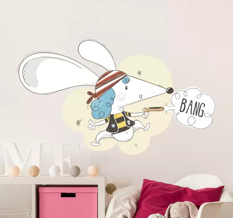 Reference: A47215Hravá karikatura myši oblečené jako pirát, doplněná pruhovanou čepicí a modrými vlasy. Tento hravý charakter drží hračku a vykřikuje 'BANG', což dodává pocit zábavy a dobrodružství, ideální pro dětské prostory.