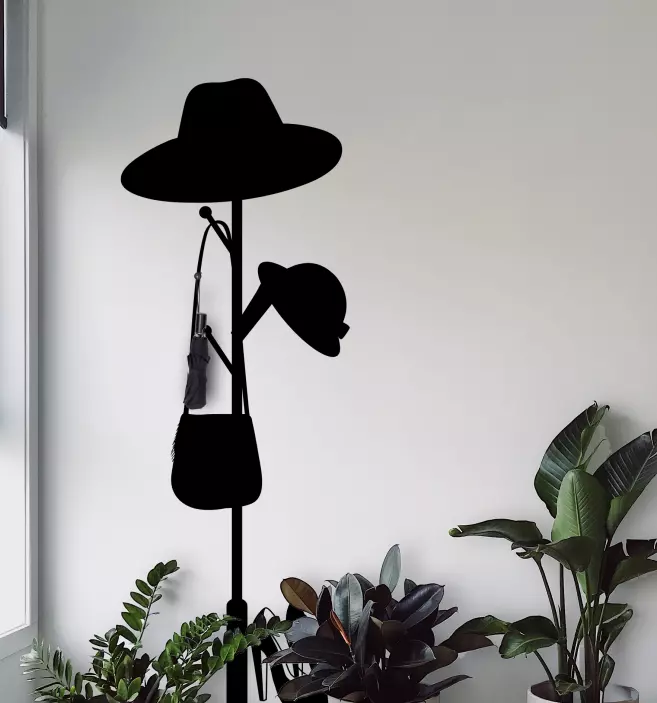 Reference: A51372Tento elegantní, moderní věšák na klobouky představuje sofistikované siluety různých pokrývek hlavy a stylové kabelky. Je navržen tak, aby uspořádal a vystavil vaše oblíbené doplňky, čímž do vašeho prostoru vnáší funkčnost a sofistikovanost.