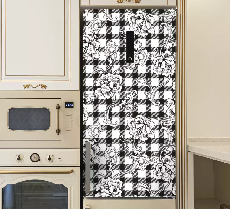 Reference: A49295Krásná kombinace květinových motivů a kostkovaných vzorů, která dodává stylový nádech kuchyňským prostorům. Tento design ukazuje složité květiny propletené s klasickým černobílým kostkovaným vzorem, čímž vytváří poutavý vizuální efekt, který obohacuje jakékoli domácí prostředí.