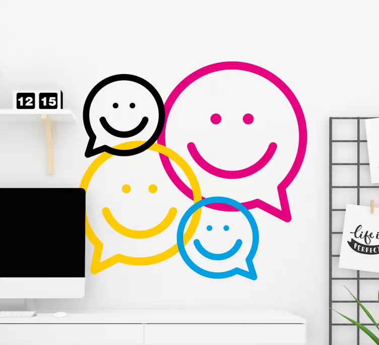 Reference: A49042Hravé uspořádání usměvavých tváří v různých velikostech a barvách představuje radost a komunikaci. Tyto veselá ikony, stylizované s bublinkami, vyvolávají emoce a vytvářejí živou atmosféru, ideální pro prostory, které mají za cíl inspirovat pozitivitu.