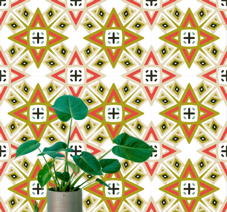 Kmenový geometrický vzor Geometrická tapeta je designovým kouskem, který přináší do vašeho interiéru moderní a stylový vzhled. S geometrickým motivem inspirovaným 70. léty a etnickými vzory v červené a zelené barvě, tato vliesová tapeta přidává do vašeho domova jedinečný a originální prvek.