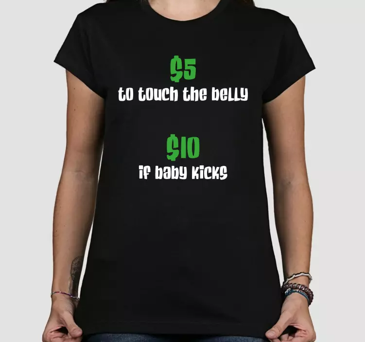 Reference: T5441Tento hravý design představuje humorný pohled na interakce během těhotenství, s tučným zeleným textem na černém pozadí. Nabízí lehkovážný návrh na dotyk bříška s hravými cenami, což ho činí ideálním pro nastávající rodiče nebo baby shower.