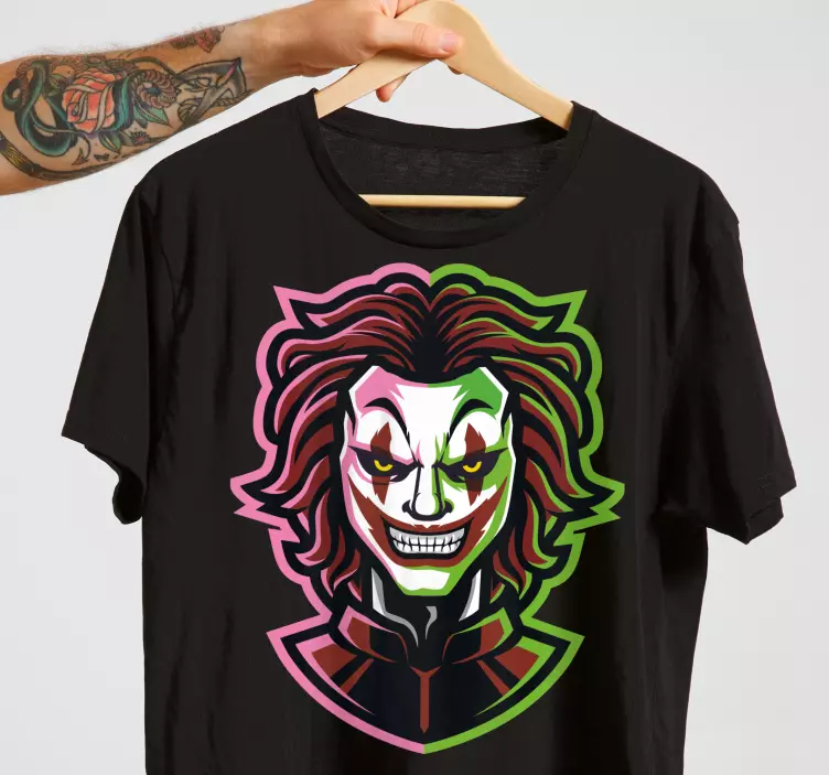 Reference: T4710Tento design představuje nápadnou a zlověstnou postavu klauna, zvýrazněnou živými barvami a hrozivým výrazem obličeje. Ideální pro Halloween, kombinuje prvky hororu s jedinečným grafickým stylem, což z něj činí výjimečný kousek pro ty, kteří si užívají strašidelnou sezónu.
