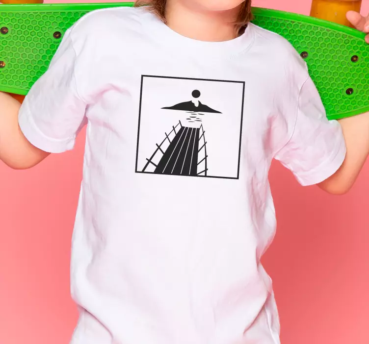Reference: T4688Tento design zobrazuje klidný západ slunce nad molo, s důrazem na dítě se skateboardem. Obrázek vyjadřuje pocit dobrodružství a zábavy venku, ideální pro děti. Jednoduché linie a tvary vytvářejí výrazný kontrast, což z něj činí vizuálně přitažlivé pro malé.