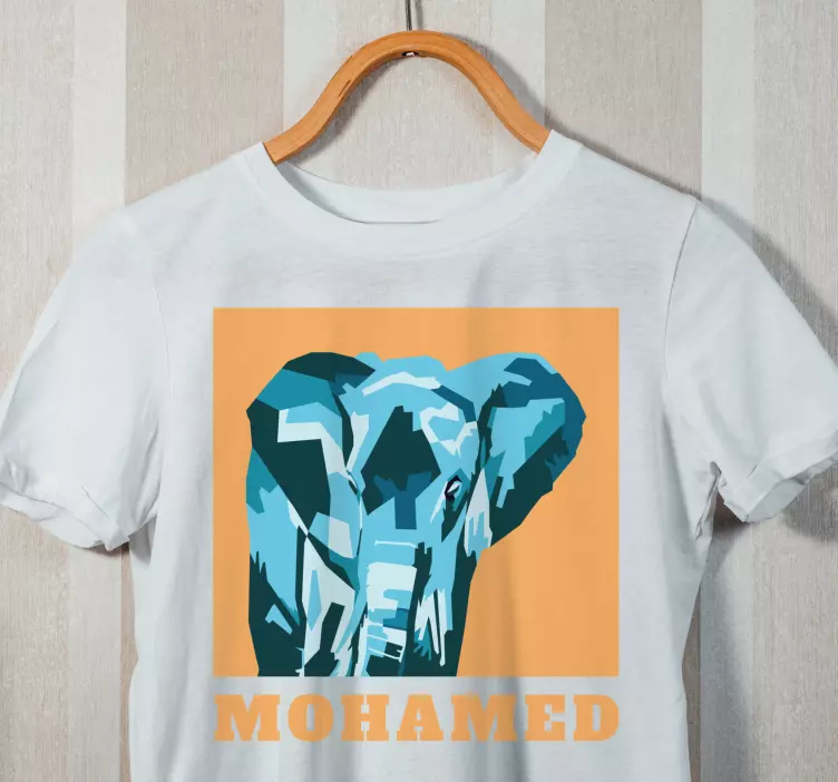 Reference: T4979Tento design představuje působivý portrét slona vytvořený v živých geometrických tvarech. Barevná paleta obsahuje různé odstíny modré, které doplňuje oranžové pozadí, což činí toto dílo fascinujícím. Jméno 'Mohamed' je výrazně zobrazeno, což dodává osobní nádech.