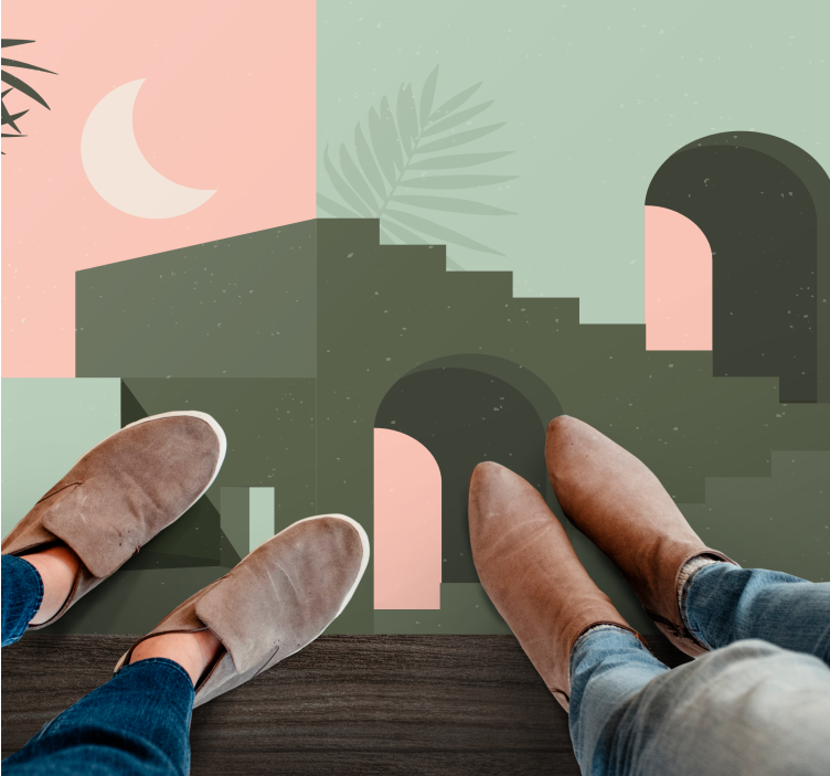 Reference: R11884Abstraktní zobrazení s minimalistickými architektonickými siluetami proti pastelovému pozadí. Scéna zahrnuje geometrické tvary připomínající budovy a arkády, s jednoduchým zobrazením palmy a půlměsíce.